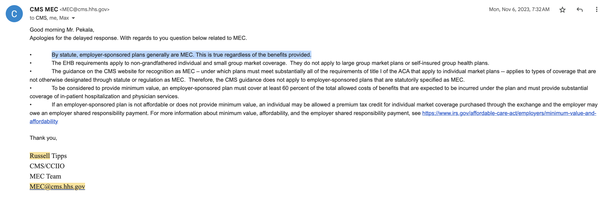It's surprising to many people that technically speaking, employer-sponsored health insurance legally doesn't have to cover much. In fact, there are many plans (deemed "MEC" plans) that exclude all hospital benefits and only cover ACA-required preventative care. They market themselves as "ACA Compliant" and cost ~$50/month.