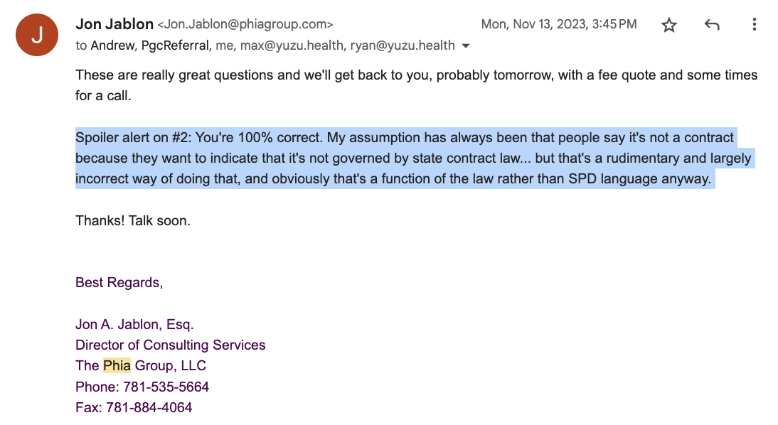 I sent this plan document to many, many people (lawyers, stoploss carriers, etc). Only two noticed this crazy provision. Yuzu hired one of them.