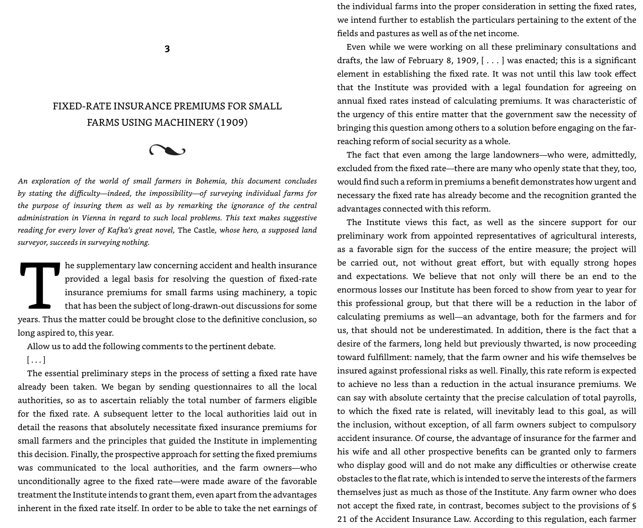 This policy not only required fixed rates for small farms, but also required that they all participate in the market. "Small farms using machinery" is probably the closest to "startups" that existed back in his day. A more complete summary of Kafka's professional life can be found here: https://www.tabletmag.com/sections/arts-letters/articles/the-office-series-day-three-kafka
